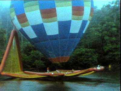 Because helicopters create a violent vertical wind that scatters wildlife and damages the forest, the project designers preferred a 3,000 m² hot air balloon to lift and drop the 750 kg raft onto the treetops.