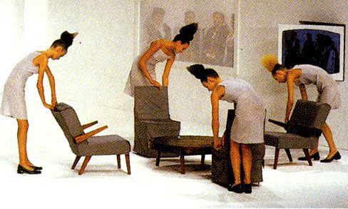 In the final scene, four models approach the chairs. Slowly, they begin unzipping and flipping over the seat covers. What seemed like ordinary upholstery is revealed to be meticulously tailored these covers are, in fact, dresses, perfectly designed to fit the geometric contours of the chairs.